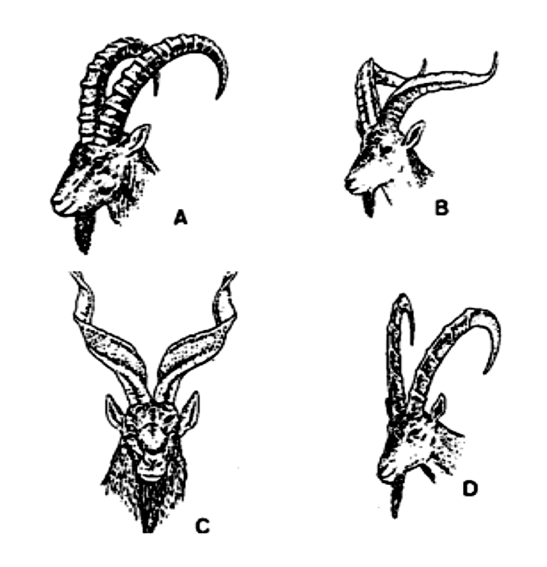 A: Capra ibex ; B : Capra pyrenaica ; C : Capra falconeri ; D: Capra hircus aegagrus.
